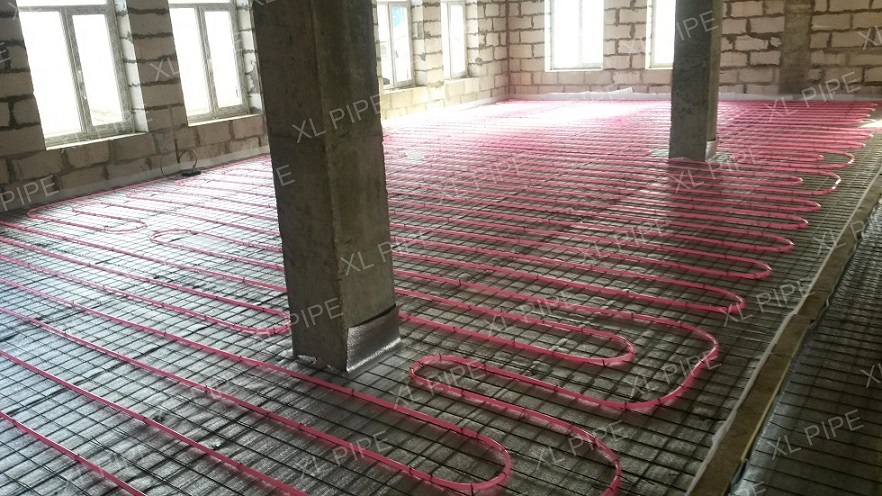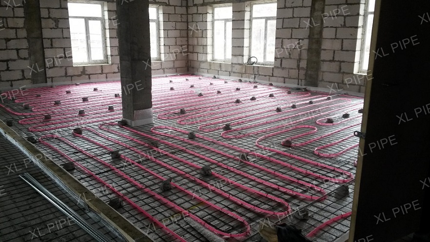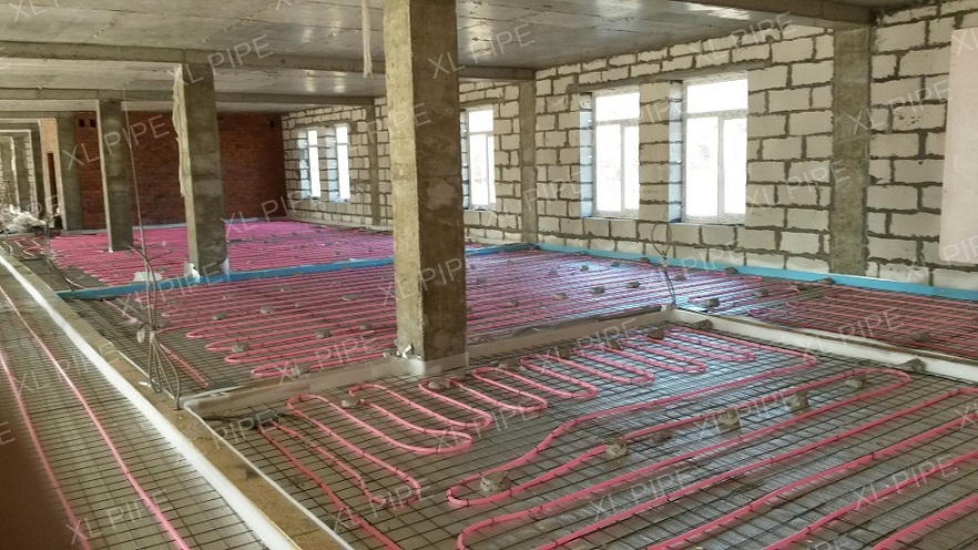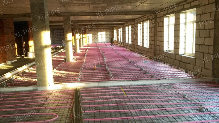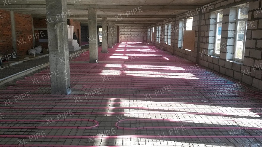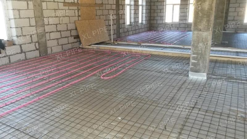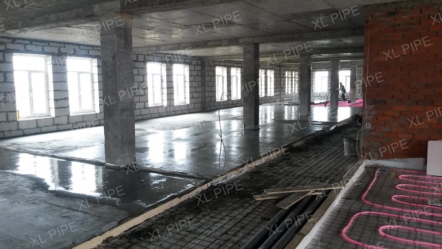 На всю отапливаемую площадь уложено 64 системы XL PIPE. Помимо укладки самих систем, дилер провел ряд подготовительных работ: подготовил основания пола, разложил утеплитель и армирующую сетку. А после укладки систем XL PIPE дилер произвел заливку пола цементно-песчаной стяжкой.